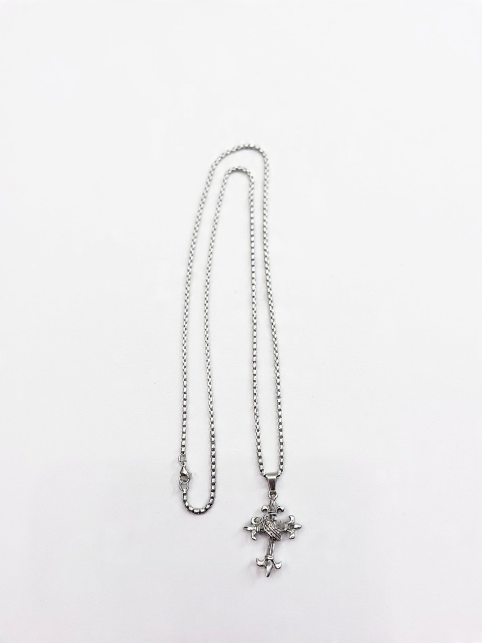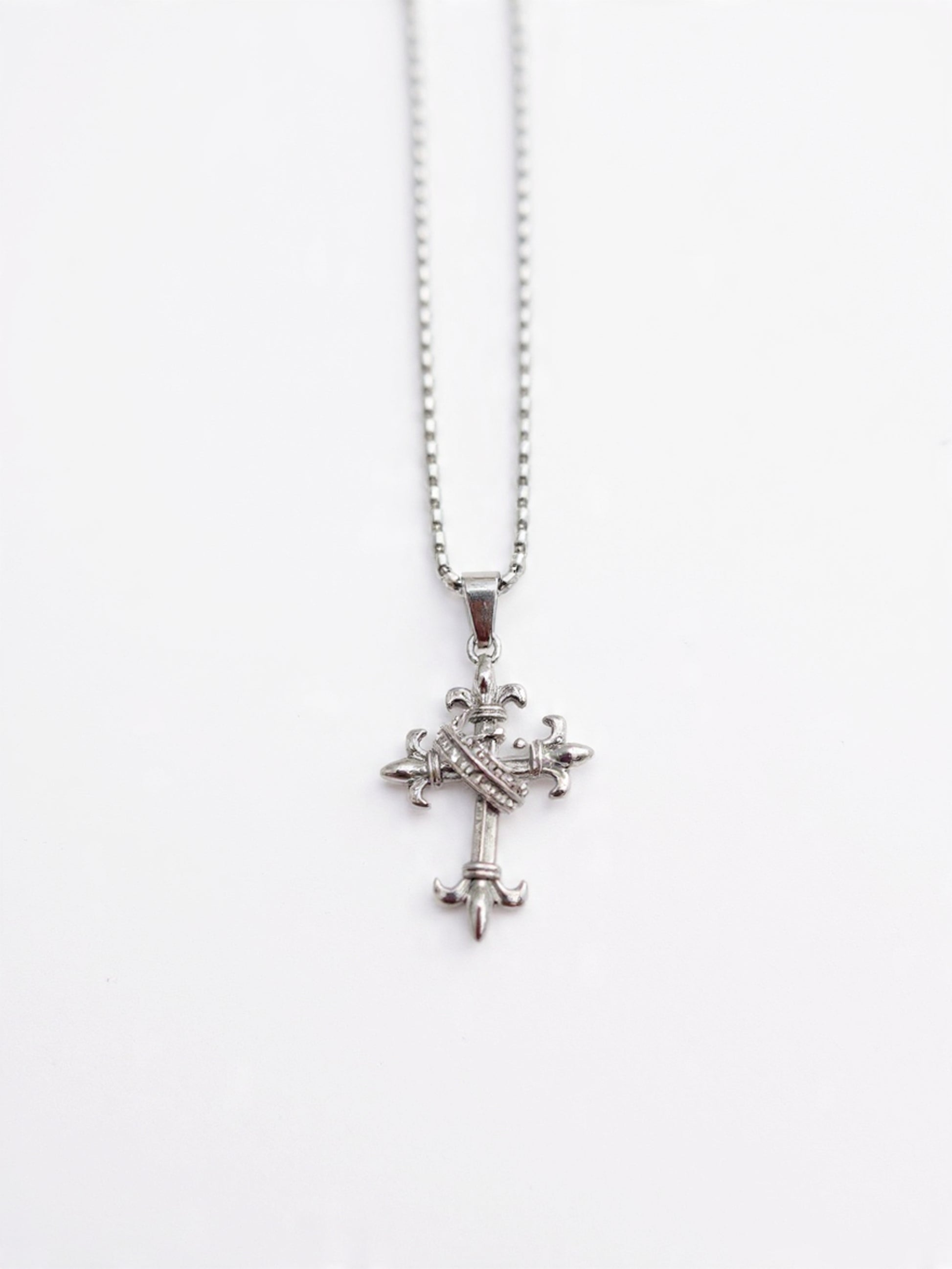 A sleek sterling silver necklace featuring a detailed cross pendant adorned with fleur-de-lis motifs at each arm and a textured diagonal band across the center, perfect for adding a stylish, symbolic touch to any outfit.
