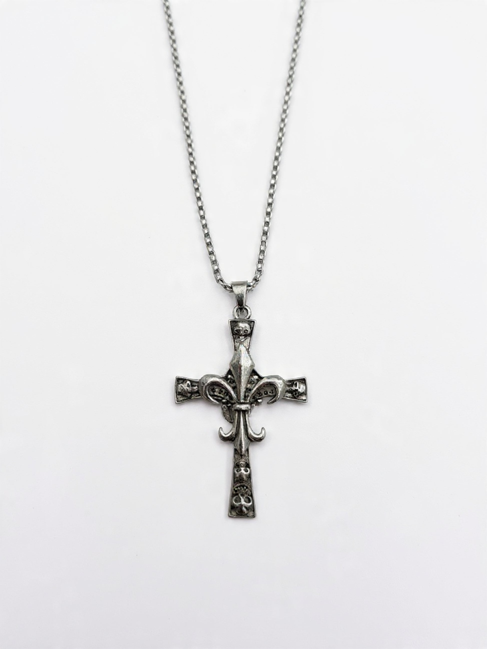Bold and striking, the Skull Fleur Gothic Cross Necklace features an ornate cross design accented with subtle skull detailing and a sculpted fleur centerpiece. Finished in an antique silver tone, this pendant delivers a dark, gothic aesthetic with intricate craftsmanship. Paired with a sturdy chain, it’s perfect for those who prefer statement accessories with attitude and character.